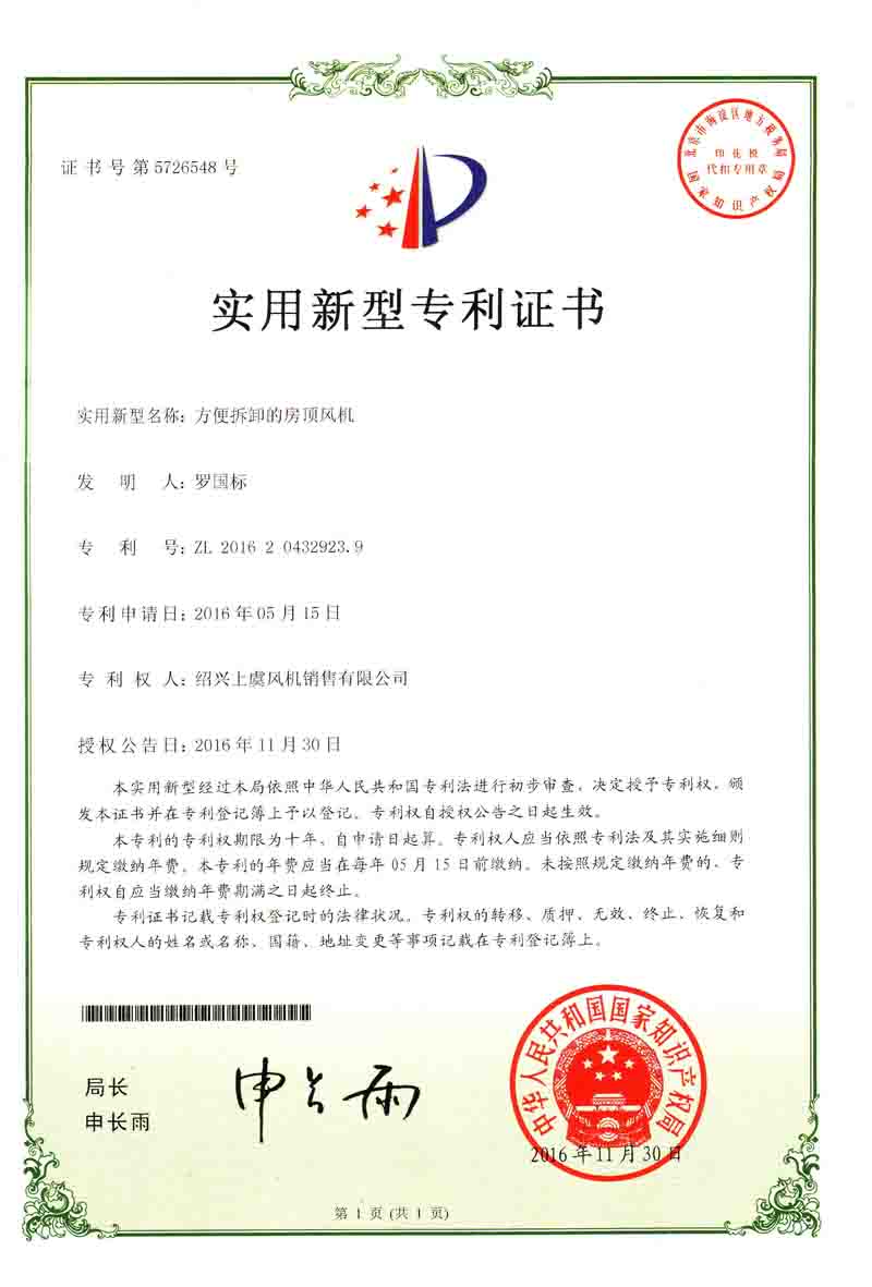 方便拆卸的房頂風(fēng)機專利證書 |